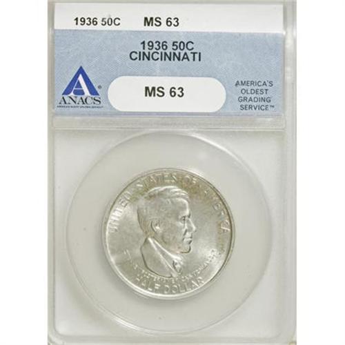 <B>1936 50C Cincinnati MS63 ANACS.</B></I> PCGS Population (221/1054). NGC Census: (67/637). Mintage: 5,005. Numismedia Wsl. Price for NGC/PCGS coin in MS63: $267. (#9283)<BR><BR><b>Shipping:</b> Coins & Currency (<a target="_blank" href="http://www.heritageauctions.com/common/shipping.php">view shipping information</a>)