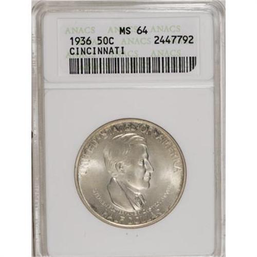 <B>1936 50C Cincinnati MS64 ANACS.</B></I> NGC Census: (357/286). PCGS Population (570/492). Mintage: 5,005. Numismedia Wsl. Price for NGC/PCGS coin in MS64: $336. (#9283)<BR><BR><b>Shipping:</b> Coins & Currency (<a target="_blank" href="http://www.heritageauctions.com/common/shipping.php">view shipping information</a>)
