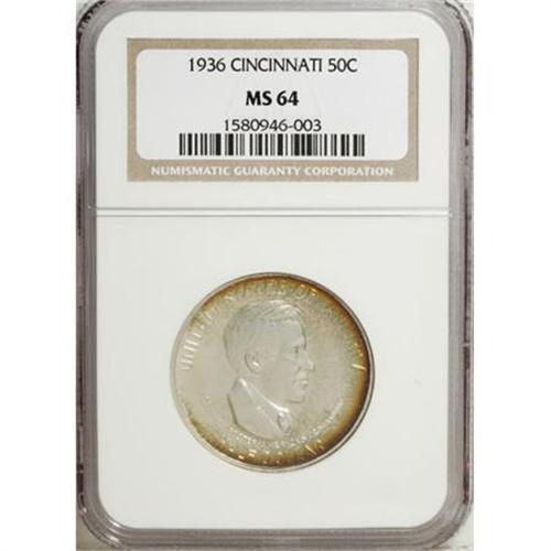 <B>1936 50C Cincinnati MS64 NGC.</B></I> NGC Census: (344/284). PCGS Population (557/477). Mintage: 5,005. Numismedia Wsl. Price for NGC/PCGS coin in MS64: $336. (#9283)<BR><BR><b>Shipping:</b> Coins & Currency (<a target="_blank" href="http://www.heritageauctions.com/common/shipping.php">view shipping information</a>\)