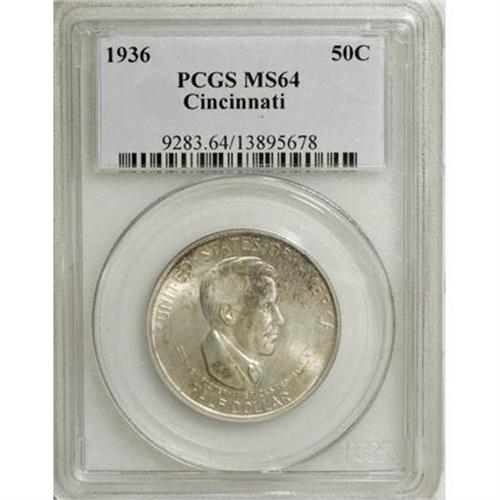 <B>1936 50C Cincinnati MS64 PCGS.</B></I> PCGS Population (555/476). NGC Census: (344/283). Mintage: 5,005. Numismedia Wsl. Price for NGC/PCGS coin in MS64: $336. (#9283)<BR><I>From The Frank DuVall Collection of U.S. Commemoratives.</B></I><BR><BR><b>Shipping:</b> Coins & Currency (<a target="_blank" href="http://www.heritageauctions.com/common/shipping.php">view shipping information</a>\)