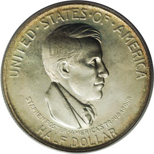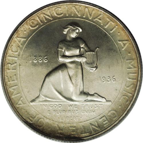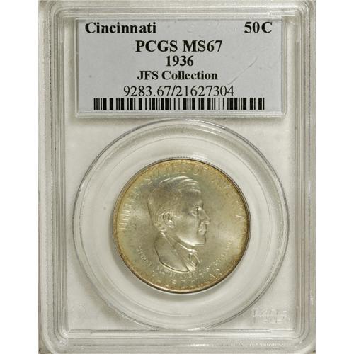 <B>1936 50C Cincinnati MS67 PCGS.</B></I> Ex: JFS Collection. Stephen Foster, the man depicted on the obverse of the Cincinnati commemorative halves, has a slightly more concrete link to the musical heritage of that city than most writers claim. Rather than being "merely a bookkeeper" during his time in Cincinnati, he actually penned several hit songs of the time, including the classic "Oh, Susanna." Still, for a coin commemorating an event that supposedly took place in 1886, Foster was an odd choice, since he had died 22 years earlier.<BR> The surfaces of this exquisitely preserved piece display pale iridescent haze over each side that deepens to reddish-gold near the rims. Vibrant luster shines beneath. A delightful Superb Gem, worthy of the finest commemorative collection. Population: 2 in 67, 0 finer (3/07).<BR><I>From The Cary & Cheryl Porter Collection.</B></I><BR><BR><b>Shipping:</b> Coins & Currency (<a target="_blank" href="http://www.heritageauctions.com/common/shipping.php">view shipping information</a>)