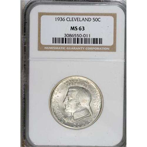 <B>1936 50C Cleveland MS63 NGC.</B></I> NGC Census: (258/3840). PCGS Population (1281/4996). Mintage: 50,030. Numismedia Wsl. Price for NGC/PCGS coin in MS63: $125. (#9288)<BR><BR><b>Shipping:</b> Coins & Currency (<a target="_blank" href="http://www.heritageauctions.com/common/shipping.php">view shipping information</a>)