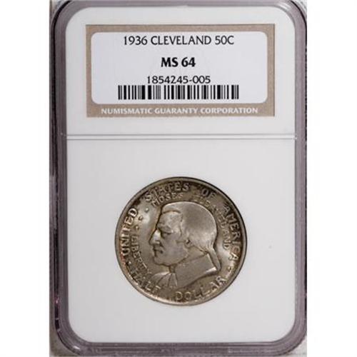 <B>1936 50C Cleveland MS64 NGC.</B></I> NGC Census: (1399/2413). PCGS Population (2527/2372). Mintage: 50,030. Numismedia Wsl. Price for NGC/PCGS coin in MS64: $136. (#9288)<BR><I>From The Frank DuVall Collection of U.S. Commemoratives.</B></I><BR><BR><b>Shipping:</b> Coins & Currency (<a target="_blank" href="http://www.heritageauctions.com/common/shipping.php">view shipping information</a>\)