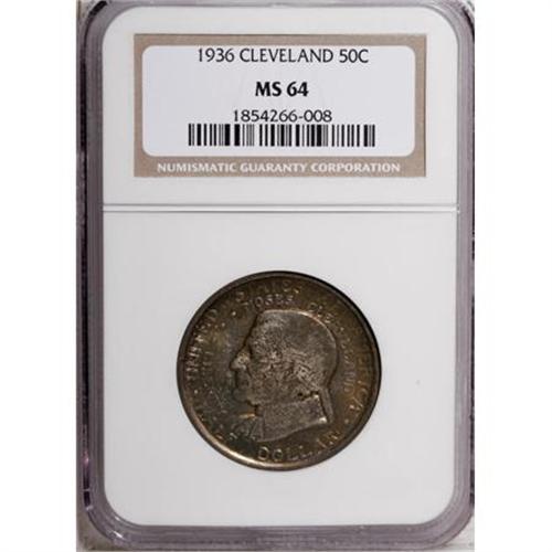 <B>1936 50C Cleveland MS64 NGC.</B></I> NGC Census: (1399/2413). PCGS Population (2527/2372). Mintage: 50,030. Numismedia Wsl. Price for NGC/PCGS coin in MS64: $136. (#9288)<BR><I>From The Frank DuVall Collection of U.S. Commemoratives.</B></I><BR><BR><b>Shipping:</b> Coins & Currency (<a target="_blank" href="http://www.heritageauctions.com/common/shipping.php">view shipping information</a>\)