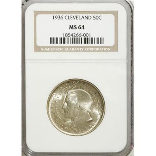 <B>1936 50C Cleveland MS64 NGC.</B></I> NGC Census: (1399/2413). PCGS Population (2527/2372). Mintage: 50,030. Numismedia Wsl. Price for NGC/PCGS coin in MS64: $136. (#9288)<BR><I>From The Frank DuVall Collection of U.S. Commemoratives.</B></I><BR><BR><b>Shipping:</b> Coins & Currency (<a target="_blank" href="http://www.heritageauctions.com/common/shipping.php">view shipping information</a>\)