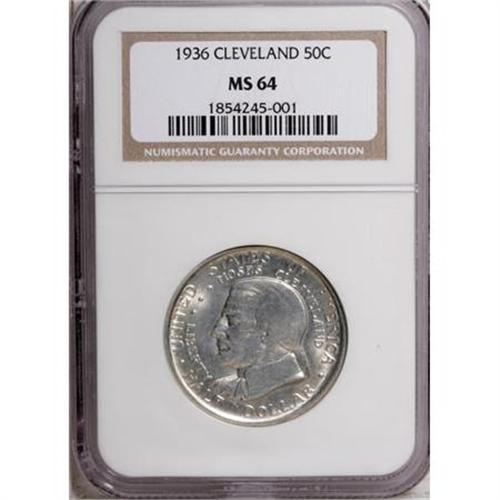 <B>1936 50C Cleveland MS64 NGC.</B></I> NGC Census: (1399/2413). PCGS Population (2527/2372). Mintage: 50,030. Numismedia Wsl. Price for NGC/PCGS coin in MS64: $136. (#9288)<BR><I>From The Frank DuVall Collection of U.S. Commemoratives.</B></I><BR><BR><b>Shipping:</b> Coins & Currency (<a target="_blank" href="http://www.heritageauctions.com/common/shipping.php">view shipping information</a>\)