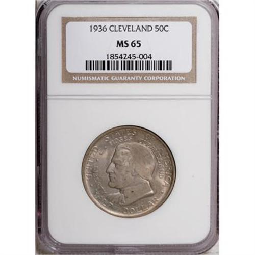 <B>1936 50C Cleveland MS65 NGC.</B></I> NGC Census: (1891/522). PCGS Population (1793/579). Mintage: 50,030. Numismedia Wsl. Price for NGC/PCGS coin in MS65: $208. (#9288)<BR><I>From The Frank DuVall Collection of U.S. Commemoratives.</B></I><BR><BR><b>Shipping:</b> Coins & Currency (<a target="_blank" href="http://www.heritageauctions.com/common/shipping.php">view shipping information</a>\)