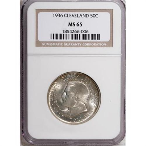 <B>1936 50C Cleveland MS65 NGC.</B></I> NGC Census: (1891/522). PCGS Population (1793/579). Mintage: 50,030. Numismedia Wsl. Price for NGC/PCGS coin in MS65: $208. (#9288)<BR><I>From The Frank DuVall Collection of U.S. Commemoratives.</B></I><BR><BR><b>Shipping:</b> Coins & Currency (<a target="_blank" href="http://www.heritageauctions.com/common/shipping.php">view shipping information</a>\)