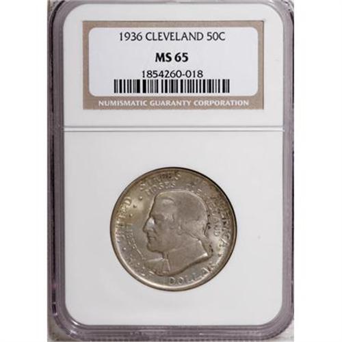 <B>1936 50C Cleveland MS65 NGC.</B></I> NGC Census: (1891/522). PCGS Population (1793/579). Mintage: 50,030. Numismedia Wsl. Price for NGC/PCGS coin in MS65: $208. (#9288)<BR><I>From The Frank DuVall Collection of U.S. Commemoratives.</B></I><BR><BR><b>Shipping:</b> Coins & Currency (<a target="_blank" href="http://www.heritageauctions.com/common/shipping.php">view shipping information</a>\)