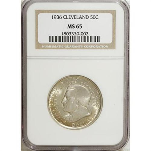 <B>1936 50C Cleveland MS65 NGC.</B></I> NGC Census: (1897/525). PCGS Population (1814/581). Mintage: 50,030. Numismedia Wsl. Price for NGC/PCGS coin in MS65: $208. (#9288)<BR><BR><b>Shipping:</b> Coins & Currency (<a target="_blank" href="http://www.heritageauctions.com/common/shipping.php">view shipping information</a>\)