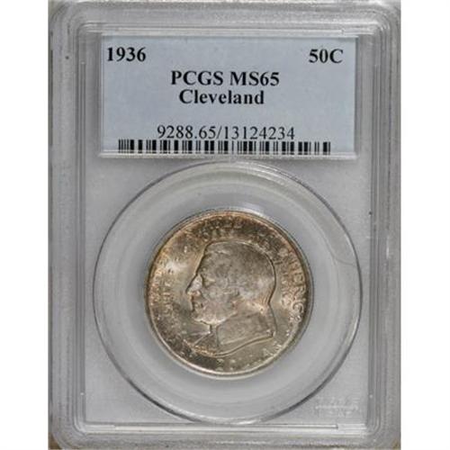 <B>1936 50C Cleveland MS65 PCGS.</B></I> PCGS Population (1814/581). NGC Census: (1897/525). Mintage: 50,030. Numismedia Wsl. Price for NGC/PCGS coin in MS65: $208. (#9288)<BR><BR><b>Shipping:</b> Coins & Currency (<a target="_blank" href="http://www.heritageauctions.com/common/shipping.php">view shipping information</a>\)