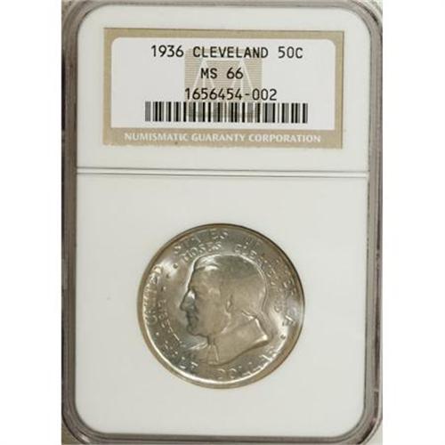 <B>1936 50C Cleveland MS66 NGC.</B></I> NGC Census: (470/48). PCGS Population (541/38). Mintage: 50,030. Numismedia Wsl. Price for NGC/PCGS coin in MS66: $420. (#9288)<BR><BR><b>Shipping:</b> Coins & Currency (<a target="_blank" href="http://www.heritageauctions.com/common/shipping.php">view shipping information</a>\)