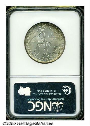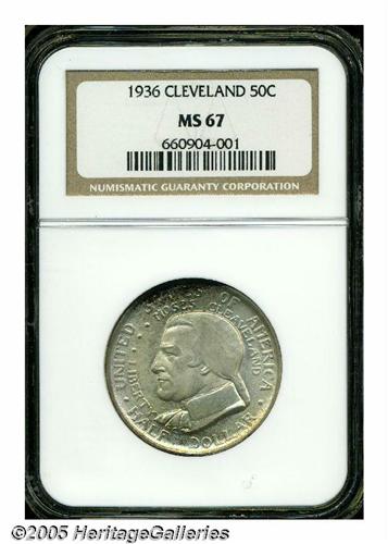 <B>1936<50C> Cleveland MS67 NGC.</B></I> Superlative example with olive-golden surfaces surrounded by deep indigo-purple rims. Sold at the exposition, many were mishandled by the public. This explains the paucity of examples in high grade. Population: 33 in 67, 3 finer (6/05).