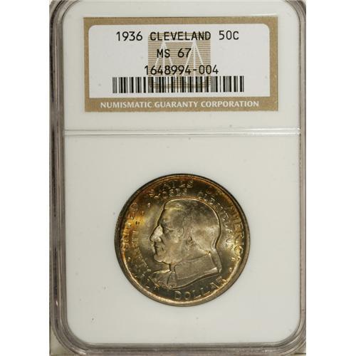 <B>1936 50C Cleveland MS67 NGC.</B></I> The crescent of tan-bronze patina that appears at the lower left of the shining reverse completely surrounds the lavender-gray center of the carefully preserved obverse. Cleveland halves were coined in both 1936 and 1937, though nothing distinguishes the pieces minted in either year. NGC has graded only six finer examples, three in MS67 <img border='0' src='http://www.heritagecoins.com/images/star.gif' width=10 height=10> and three in MS68 (3/07).<BR><I>From The Cary & Cheryl Porter Collection.</B></I><BR><BR><b>Shipping:</b> Coins & Currency (<a target="_blank" href="http://www.heritageauctions.com/common/shipping.php">view shipping information</a>)
