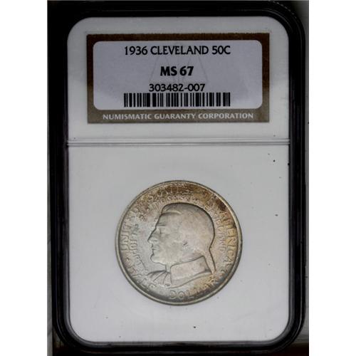 <B>1936<50C> Cleveland MS67 NGC.</B></I> The surfaces of this Superb Gem example display pale silvery-gray color with peripheral gold and iridescent highlights. This example is approaching the finest available for the issue, with only four finer coins certified by both PCGS and NGC (2/06).