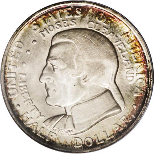 <B>1936<50C> Cleveland MS67 PCGS.</B></I> Creamy-smooth surfaces are softly patinated with dove-gray and deeper splashes of lime-gold and deep crimson toning about the obverse margin. Just a couple of minor marks are seen under close examination and a single dark toning spot near Cleveland's ear is the only mentionable pedigree identifier. Population: 36 in 67, 1 finer (4/06).