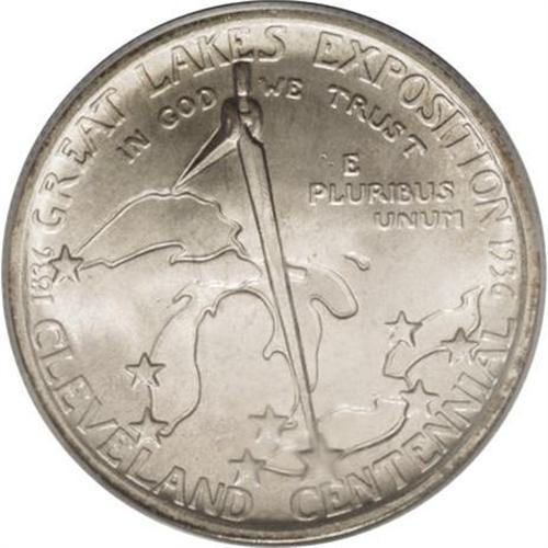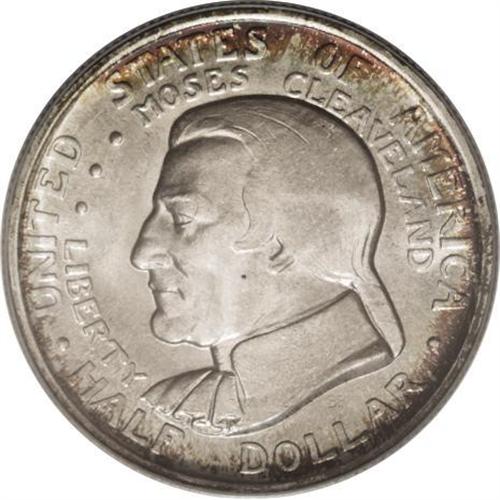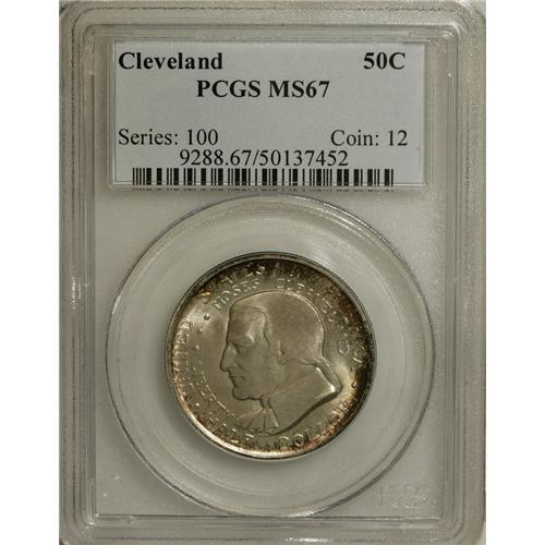 <B>1936 50C Cleveland MS67 PCGS.</B></I> The issue depicts Moses Cleaveland, of the Connecticut Land Company, which bought more than 3 million acres of land in northeastern Ohio. Creamy-smooth surfaces are softly patinated with dove-gray and deeper splashes of lime-gold and deep crimson toning about the obverse margin. The few tiny abrasions noted are grade-consistent.<BR><BR><b>Shipping:</b> Coins & Currency (<a target="_blank" href="http://www.heritageauctions.com/common/shipping.php">view shipping information</a>)