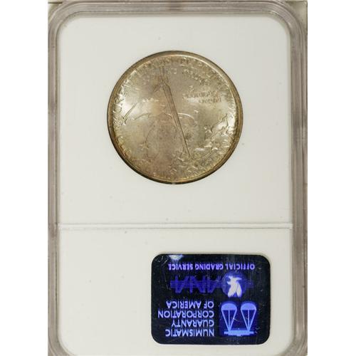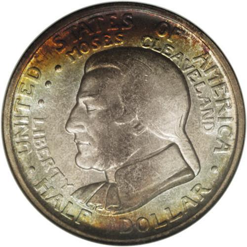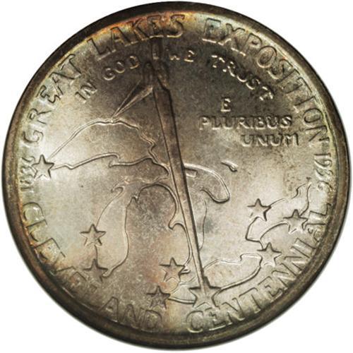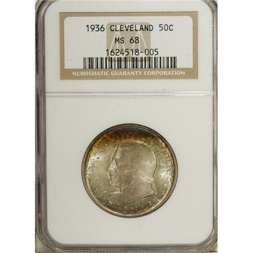 <B>1936 50C Cleveland MS68 NGC.</B></I> One of the various issues created to celebrate an exposition, the Cleveland Centennial-Great Lakes Exposition half is the lone commemorative design credit for Brenda Putnam. This wonderful piece showcases her work, with cerulean, rose, and gold arcs at the top and bottom of the obverse. Aqua patina graces the obverse and the reverse, which has a splash of orange at the compass. NGC has certified just three coins as MS68, while PCGS has awarded that grade just once, with none finer at either service (3/07).<BR><I>From The Cary & Cheryl Porter Collection.</B></I><BR><BR><b>Shipping:</b> Coins & Currency (<a target="_blank" href="http://www.heritageauctions.com/common/shipping.php">view shipping information</a>)
