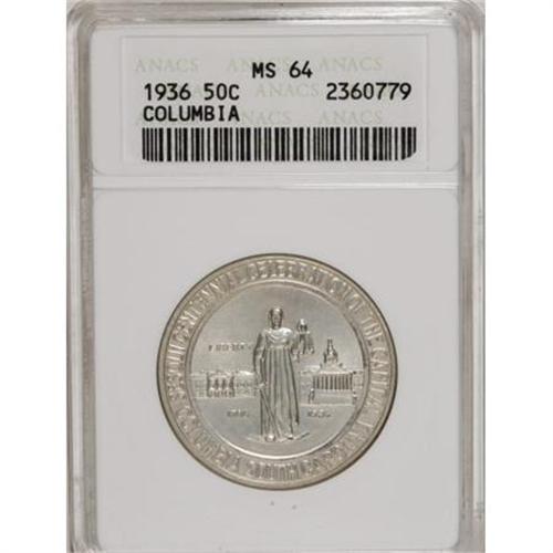<B>1936 50C Columbia MS64 ANACS.</B></I> NGC Census: (233/1068). PCGS Population (583/1194). Mintage: 9,007. Numismedia Wsl. Price for NGC/PCGS coin in MS64: $244. (#9291)<BR><BR><b>Shipping:</b> Coins & Currency (<a target="_blank" href="http://www.heritageauctions.com/common/shipping.php">view shipping information</a>)
