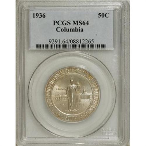 <B>1936 50C Columbia MS64 PCGS.</B></I> PCGS Population (582/1187). NGC Census: (229/1059). Mintage: 9,007. Numismedia Wsl. Price for NGC/PCGS coin in MS64: $244. (#9291)<BR><BR><b>Shipping:</b> Coins & Currency (<a target="_blank" href="http://www.heritageauctions.com/common/shipping.php">view shipping information</a>)
