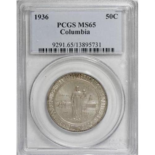 <B>1936 50C Columbia MS65 PCGS.</B></I> PCGS Population (761/406). NGC Census: (534/518). Mintage: 9,007. Numismedia Wsl. Price for NGC/PCGS coin in MS65: $320. (#9291)<BR><I>From The Frank DuVall Collection of U.S. Commemoratives.</B></I><BR><BR><b>Shipping:</b> Coins & Currency (<a target="_blank" href="http://www.heritageauctions.com/common/shipping.php">view shipping information</a>\)