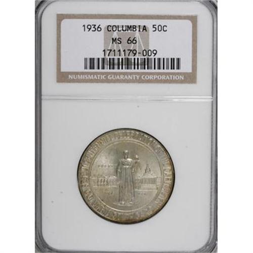 <B>1936 50C Columbia MS66 NGC.</B></I> NGC Census: (461/63). PCGS Population (359/53). Mintage: 9,007. Numismedia Wsl. Price for NGC/PCGS coin in MS66: $440. (#9291)<BR><BR><b>Shipping:</b> Coins & Currency (<a target="_blank" href="http://www.heritageauctions.com/common/shipping.php">view shipping information</a>)