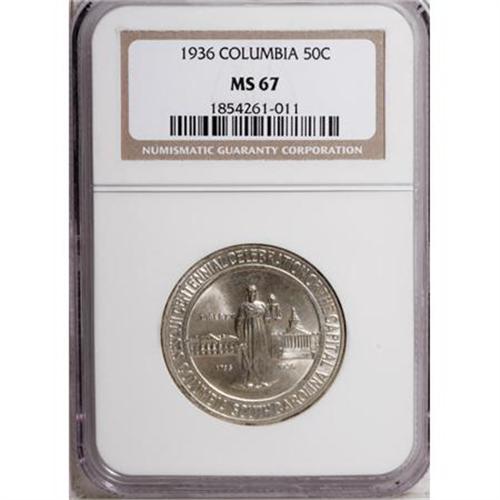 <B>1936 50C Columbia MS67 NGC.</B></I> NGC Census: (60/2). PCGS Population (52/0). Mintage: 9,007. Numismedia Wsl. Price for NGC/PCGS coin in MS67: $875. (#9291)<BR><I>From The Frank DuVall Collection of U.S. Commemoratives.</B></I><BR><BR><b>Shipping:</b> Coins & Currency (<a target="_blank" href="http://www.heritageauctions.com/common/shipping.php">view shipping information</a>\)