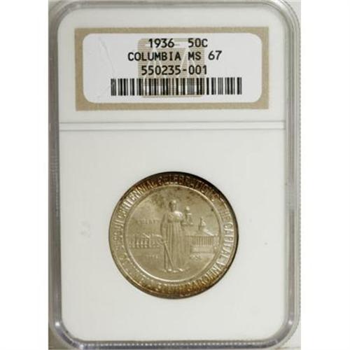 <B>1936 50C Columbia MS67 NGC.</B></I> An eminently appealing representative of this P-mint issue, luminous beneath silver-gray patina with areas of rose and claret at the upper obverse and the lower obverse and reverse. Exquisitely preserved and at the high end for the grade.<BR><BR><b>Shipping:</b> Coins & Currency (<a target="_blank" href="http://www.heritageauctions.com/common/shipping.php">view shipping information</a>)