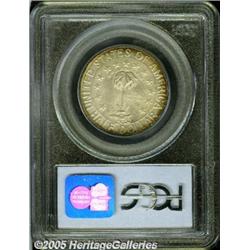 <B>1936 50C Columbia MS67 PCGS.</B></I> Sharply struck and lustrous, with impeccably preserved surfaces and lovely rainbow toning, near the obverse and reverse peripheries. None have been graded any higher, by PCGS. Population: 47 in 67, 0 finer (2/05).