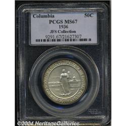 <B>1936<50C> Columbia MS67 PCGS.</B></I> A trim ring of russet color hugs the peripheries tightly. The devices and surfaces boast a wholesome matte-like luster. Typically fully struck, and impressively preserved, with just a few small nicks on the obverse. No example has been graded finer, by PCGS. Population: 49 in 67, 0 finer (6/04).<BR><I>Ex: Long Beach Signature Sale (Heritage, 2/03), lot 8860, which realized $1,265.</B></I><BR><I>From the JFS Collection, the #1 All-Time PCGS Registry Set.</B></I> <BR><BR><B>Important notice:</B> Heritage usually auctions material at the rate of 200-250 lots per hour. On some occasions eBay Live bid software or the Internet may not be able to keep up with the pace of the auction. We recommend placing a realistic absentee bid now as insurance to avoid disappointment. Occasionally the auctioneer may eliminate or reject an eBay Live bid, and the auctioneer may also reopen a lot after the close of the eBay live bidding (usually because we missed an audience bid), and may reject your bid even if it shows you as the winning bidder. By bidding via eBay Live, you agree that Heritage may award the lot to another bidder at its sole discretion under the circumstances described above or any other reasonable circumstances. Since eBay bids are not shown to us until we open the lot on the floor, we treat those bids just like floor bids. In most cases the floor responds before the eBay bid is presented to us, due to Internet lag time, so for consistency we have made it a policy that floor bids are always considered first over tie eBay live bids. Also please note that all Heritage lots purchased through eBay Live carry a 20% Buyer's Premium. Please make sure you read the Terms and Conditions before you bid. </span></font></tr></table></td></tr></table>
