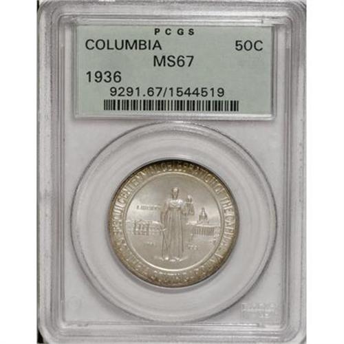 <B>1936 50C Columbia MS67 PCGS.</B></I> Satiny silver-gray centers with elements of tan and violet at the margins. The strike is crisp and the surfaces are virtually immaculate. This magnificent Superb Gem is tied for the finest certified by PCGS (12/07).<BR><BR><b>Shipping:</b> Coins & Currency (<a target="_blank" href="http://www.heritageauctions.com/common/shipping.php">view shipping information</a>)