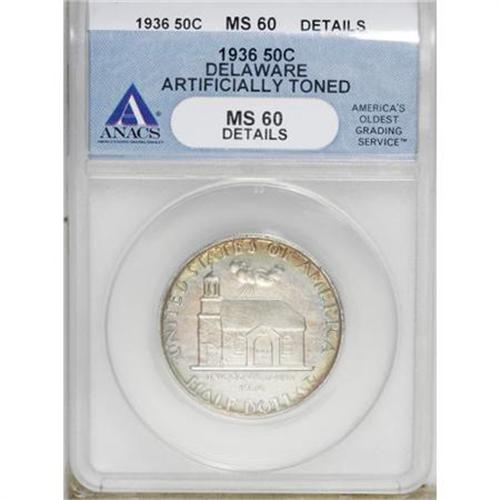 <B>1936 50C Delaware--Artificially Toned--ANACS. MS60 Details.</B></I> NGC Census: (1/2435). PCGS Population (4/3855). Mintage: 20,993. Numismedia Wsl. Price for NGC/PCGS coin in MS60: $271. (#9301)<BR><BR><b>Shipping:</b> Coins & Currency (<a target="_blank" href="http://www.heritageauctions.com/common/shipping.php">view shipping information</a>)