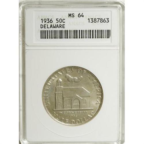 <B>1936 50C Delaware MS64 ANACS.</B></I> NGC Census: (795/1455). PCGS Population (1330/1832). Mintage: 20,993. Numismedia Wsl. Price for NGC/PCGS coin in MS64: $320. (#9301)<BR><BR><b>Shipping:</b> Coins & Currency (<a target="_blank" href="http://www.heritageauctions.com/common/shipping.php">view shipping information</a>)