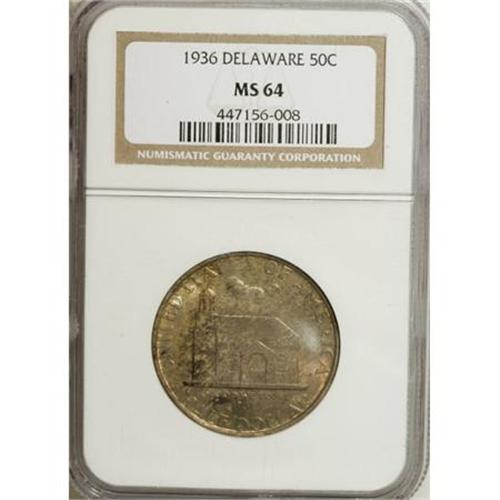 <B>1936 50C Delaware MS64 NGC.</B></I> NGC Census: (788/1432). PCGS Population (1317/1818). Mintage: 20,993. Numismedia Wsl. Price for NGC/PCGS coin in MS64: $320. (#9301)<BR><BR><b>Shipping:</b> Coins & Currency (<a target="_blank" href="http://www.heritageauctions.com/common/shipping.php">view shipping information</a>\)