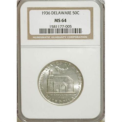 <B>1936 50C Delaware MS64 NGC.</B></I> NGC Census: (800/1471). PCGS Population (1332/1849). Mintage: 20,993. Numismedia Wsl. Price for NGC/PCGS coin in MS64: $320. (#9301)<BR><BR><b>Shipping:</b> Coins & Currency (<a target="_blank" href="http://www.heritageauctions.com/common/shipping.php">view shipping information</a>)