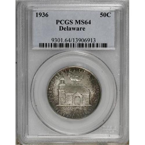 <B>1936 50C Delaware MS64 PCGS.</B></I> PCGS Population (1341/1865). NGC Census: (802/1479). Mintage: 20,993. Numismedia Wsl. Price for NGC/PCGS coin in MS64: $300. (#9301)<BR><BR><b>Shipping:</b> Coins & Currency (<a target="_blank" href="http://www.heritageauctions.com/common/shipping.php">view shipping information</a>)
