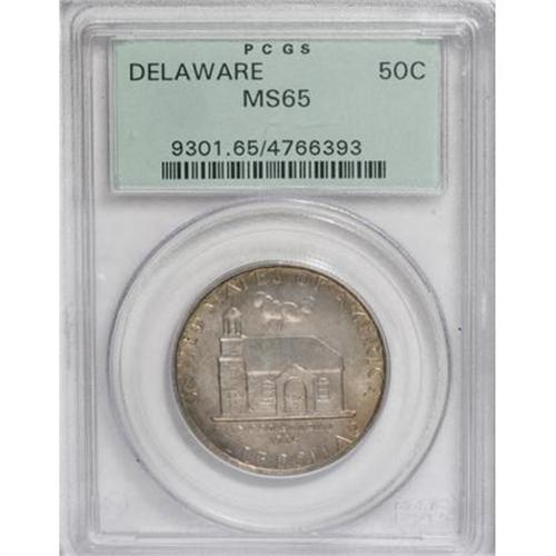 <B>1936 50C Delaware MS65 PCGS.</B></I> PCGS Population (1195/623). NGC Census: (965/467). Mintage: 20,993. Numismedia Wsl. Price for NGC/PCGS coin in MS65: $396. (#9301)<BR><BR><b>Shipping:</b> Coins & Currency (<a target="_blank" href="http://www.heritageauctions.com/common/shipping.php">view shipping information</a>\)