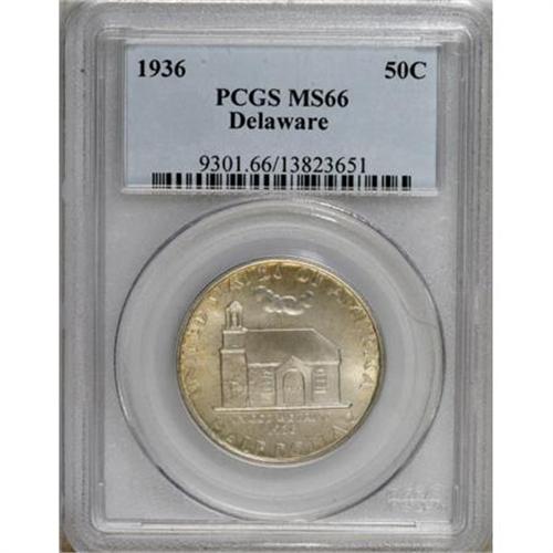 <B>1936 50C Delaware MS66 PCGS.</B></I> PCGS Population (562/61). NGC Census: (401/76). Mintage: 20,993. Numismedia Wsl. Price for NGC/PCGS coin in MS66: $620. (#9301)<BR><BR><b>Shipping:</b> Coins & Currency (<a target="_blank" href="http://www.heritageauctions.com/common/shipping.php">view shipping information</a>\)