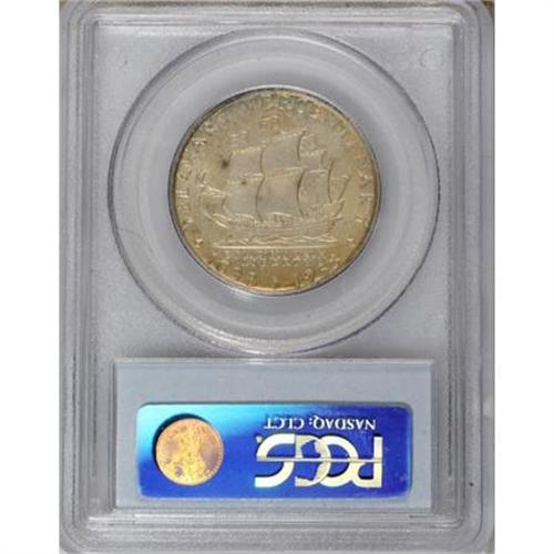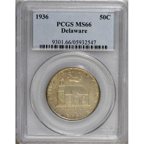 <B>1936 50C Delaware MS66 PCGS.</B></I> A luminous and well-defined representative of this colonial-history commemorative, olive-gold in the centers with soft sky-blue toning at the margins. A pair of small, shallow marks are noted at the right side of the church.<BR><BR><b>Shipping:</b> Coins & Currency (<a target="_blank" href="http://www.heritageauctions.com/common/shipping.php">view shipping information</a>)
