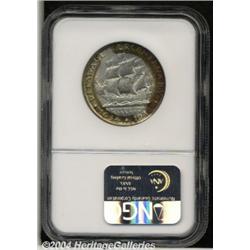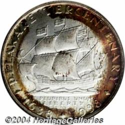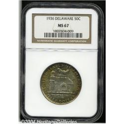 <B>1936<50C> Delaware MS67 NGC.</B></I> Russet and antique-gold tab toning is seen on the reverse with the latter color overlaying the obverse in a more-or-less even fashion. A few emerald-green accents are also noted on each side. Fully lustrous with delicate, yet appreciable cartwheel visual effects swirling around nearly pristine features. <BR><BR><B>Important notice:</B> Heritage usually auctions material at the rate of 200-250 lots per hour. On some occasions eBay Live bid software or the Internet may not be able to keep up with the pace of the auction. We recommend placing a realistic absentee bid now as insurance to avoid disappointment. Occasionally the auctioneer may eliminate or reject an eBay Live bid, and the auctioneer may also reopen a lot after the close of the eBay live bidding (usually because we missed an audience bid), and may reject your bid even if it shows you as the winning bidder. By bidding via eBay Live, you agree that Heritage may award the lot to another bidder at its sole discretion under the circumstances described above or any other reasonable circumstances. Since eBay bids are not shown to us until we open the lot on the floor, we treat those bids just like floor bids. In most cases the floor responds before the eBay bid is presented to us, due to Internet lag time, so for consistency we have made it a policy that floor bids are always considered first over tie eBay live bids. Also please note that all Heritage lots purchased through eBay Live carry a 20% Buyer's Premium. Please make sure you read the Terms and Conditions before you bid. </span></font></tr></table></td></tr></table>