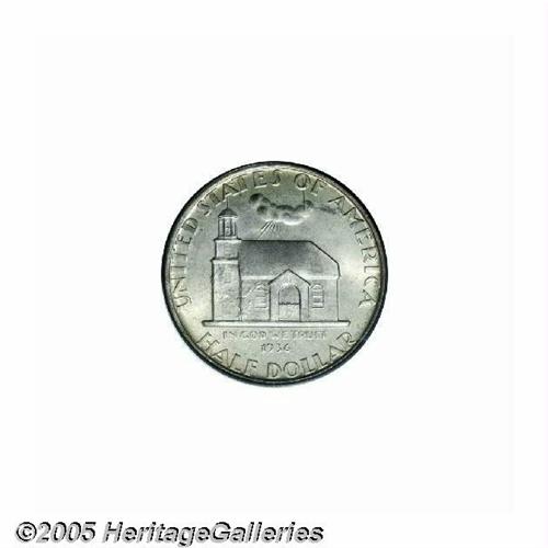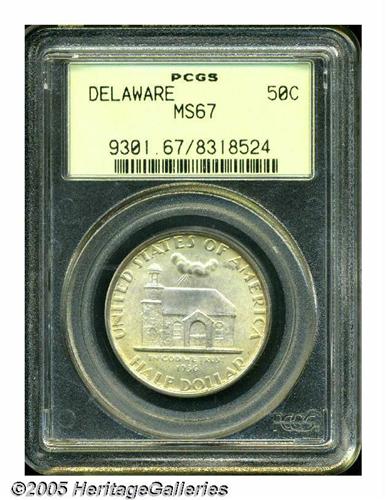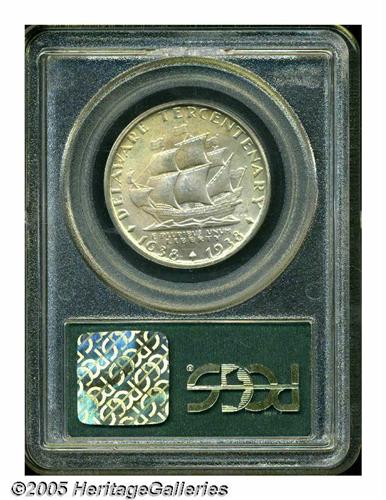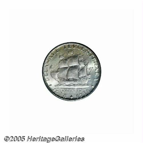<B>1936<50C> Delaware MS67 PCGS.</B></I> Lovely apricot, gunmetal-gray, and lime colors endow this lustrous and essentially pristine Superb Gem. The strike is sharp, although not complete, on the sails. Certified in a green label holder. Population: 56 in 67, 0 finer (5/05).
