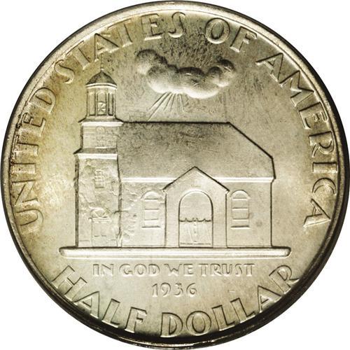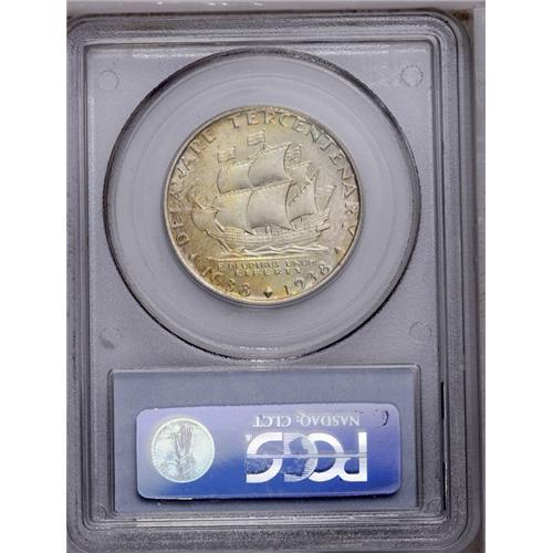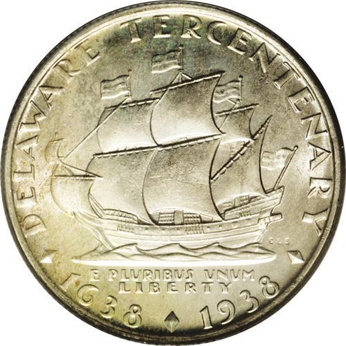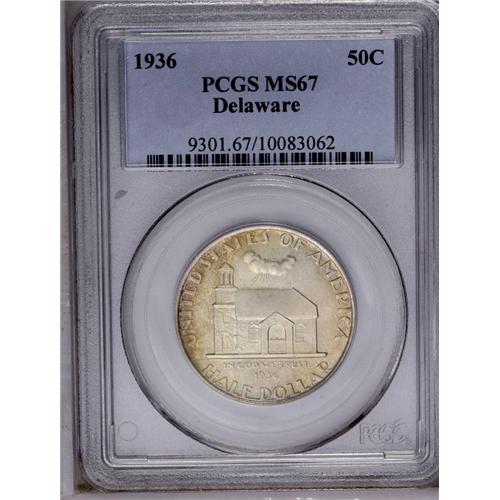 <B>1936<50C> Delaware MS67 PCGS.</B></I> Sharply struck with a veil of light golden-toning over satiny luster. The left side of the obverse and reverse show smoky-tan and lime-green accents. The pristine surfaces are seemingly free of distracting marks. Population: 57 in 67, 0 finer (4/06).