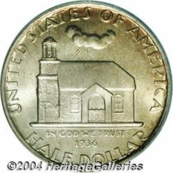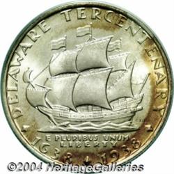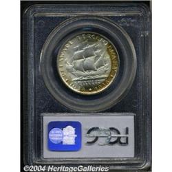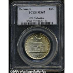 <B>1936<50C> Delaware MS67 PCGS.</B></I> Typically well struck with lovely orange and gold peripheral toning near some of the peripheries on each side. Lovely speckled apricot patina adorns the obverse fields and centers, and there are a couple of trivial, stray contact marks on the reverse. A graciously toned, expertly preserved Superb Gem, with bright, flashy luster and exquisite visual appeal. Population: 54 in 67, 0 finer (3/04).<BR><I>Ex: FUN Signature Sale (Heritage, 1/03), lot 6840, which realized $1,955.</B></I><BR><I>From the JFS Collection, the #1 All-Time PCGS Registry Set.</B></I> <BR><BR><B>Important notice:</B> Heritage usually auctions material at the rate of 200-250 lots per hour. On some occasions eBay Live bid software or the Internet may not be able to keep up with the pace of the auction. We recommend placing a realistic absentee bid now as insurance to avoid disappointment. Occasionally the auctioneer may eliminate or reject an eBay Live bid, and the auctioneer may also reopen a lot after the close of the eBay live bidding (usually because we missed an audience bid), and may reject your bid even if it shows you as the winning bidder. By bidding via eBay Live, you agree that Heritage may award the lot to another bidder at its sole discretion under the circumstances described above or any other reasonable circumstances. Since eBay bids are not shown to us until we open the lot on the floor, we treat those bids just like floor bids. In most cases the floor responds before the eBay bid is presented to us, due to Internet lag time, so for consistency we have made it a policy that floor bids are always considered first over tie eBay live bids. Also please note that all Heritage lots purchased through eBay Live carry a 20% Buyer's Premium. Please make sure you read the Terms and Conditions before you bid. </span></font></tr></table></td></tr></table>