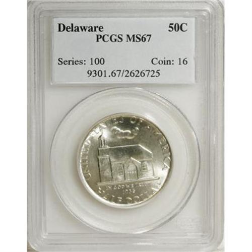 <B>1936 50C Delaware MS67 PCGS.</B></I> The shining and essentially untoned surfaces of this Delaware Superb Gem approach flawlessness. The sails show a handful of tiny marks, though most of these were present on the planchet prior to striking. A delightful piece, tied for the finest certified by PCGS (9/07).<BR><I>From The Sterling Collection.</B></I><BR><BR><b>Shipping:</b> Coins & Currency (<a target="_blank" href="http://www.heritageauctions.com/common/shipping.php">view shipping information</a>)