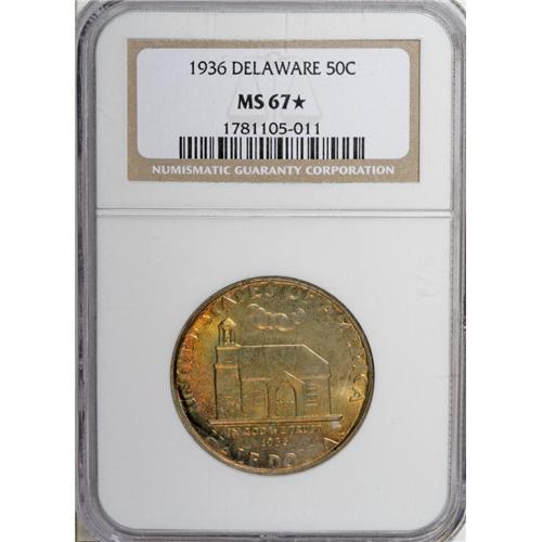 <B>1936 50C Delaware MS67 <img border='0' src='http://www.heritagecoins.com/images/star.gif' width=10 height=10> NGC.</B></I> Varying hues of emerald-green, lavender, crimson, and gold toning grace the lustrous, pristine surfaces. The solidly struck reverse is tab-toned. Only seven Superb Gems have received the Star Designation from NGC, and no finer examples have the honor (11/06).<BR><BR><b>Shipping:</b> Coin/Currency (<a target="_blank" href="http://www.heritageauctions.com/common/shipping.php">view shipping information</a>)