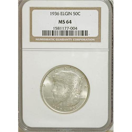 <B>1936 50C Elgin MS64 NGC.</B></I> NGC Census: (684/2078). PCGS Population (1689/2972). Mintage: 20,015. Numismedia Wsl. Price for NGC/PCGS coin in MS64: $236. (#9303)<BR><BR><b>Shipping:</b> Coins & Currency (<a target="_blank" href="http://www.heritageauctions.com/common/shipping.php">view shipping information</a>)