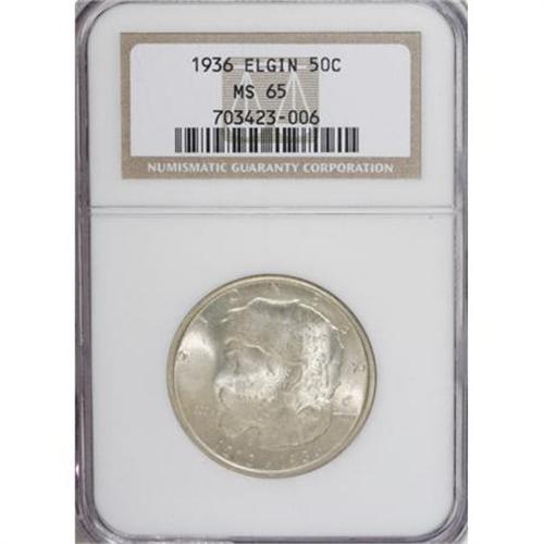 <B>1936 50C Elgin MS65 NGC.</B></I> NGC Census: (1234/810). PCGS Population (1855/1080). Mintage: 20,015. Numismedia Wsl. Price for NGC/PCGS coin in MS65: $300. (#9303)<BR><BR><b>Shipping:</b> Coins & Currency (<a target="_blank" href="http://www.heritageauctions.com/common/shipping.php">view shipping information</a>)