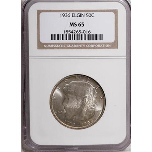 <B>1936 50C Elgin MS65 NGC.</B></I> NGC Census: (1234/810). PCGS Population (1855/1080). Mintage: 20,015. Numismedia Wsl. Price for NGC/PCGS coin in MS65: $300. (#9303)<BR><I>From The Frank DuVall Collection of U.S. Commemoratives.</B></I><BR><BR><b>Shipping:</b> Coins & Currency (<a target="_blank" href="http://www.heritageauctions.com/common/shipping.php">view shipping information</a>\)