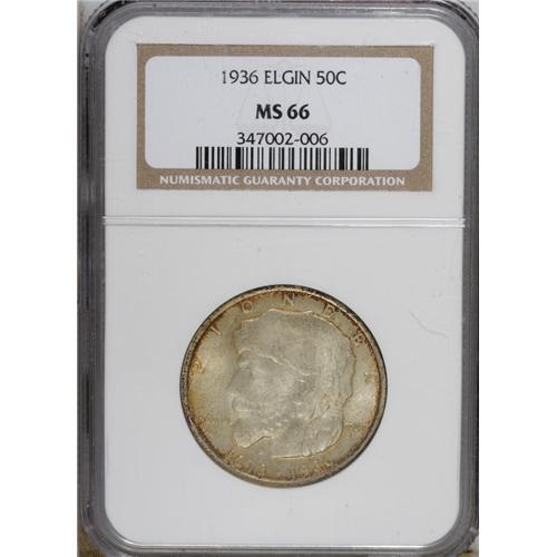 <B>1936 50C Elgin MS66 NGC.</B></I> NGC Census: (695/110). PCGS Population (961/112). Mintage: 20,015. Numismedia Wsl. Price: $432. (#9303)<BR><BR><b>Shipping:</b> Coins & Currency (<a target="_blank" href="http://www.heritageauctions.com/common/shipping.php">view shipping information</a>)