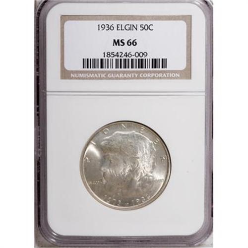 <B>1936 50C Elgin MS66 NGC.</B></I> NGC Census: (699/111). PCGS Population (967/113). Mintage: 20,015. Numismedia Wsl. Price for NGC/PCGS coin in MS66: $436. (#9303)<BR><I>From The Frank DuVall Collection of U.S. Commemoratives.</B></I><BR><BR><b>Shipping:</b> Coins & Currency (<a target="_blank" href="http://www.heritageauctions.com/common/shipping.php">view shipping information</a>\)